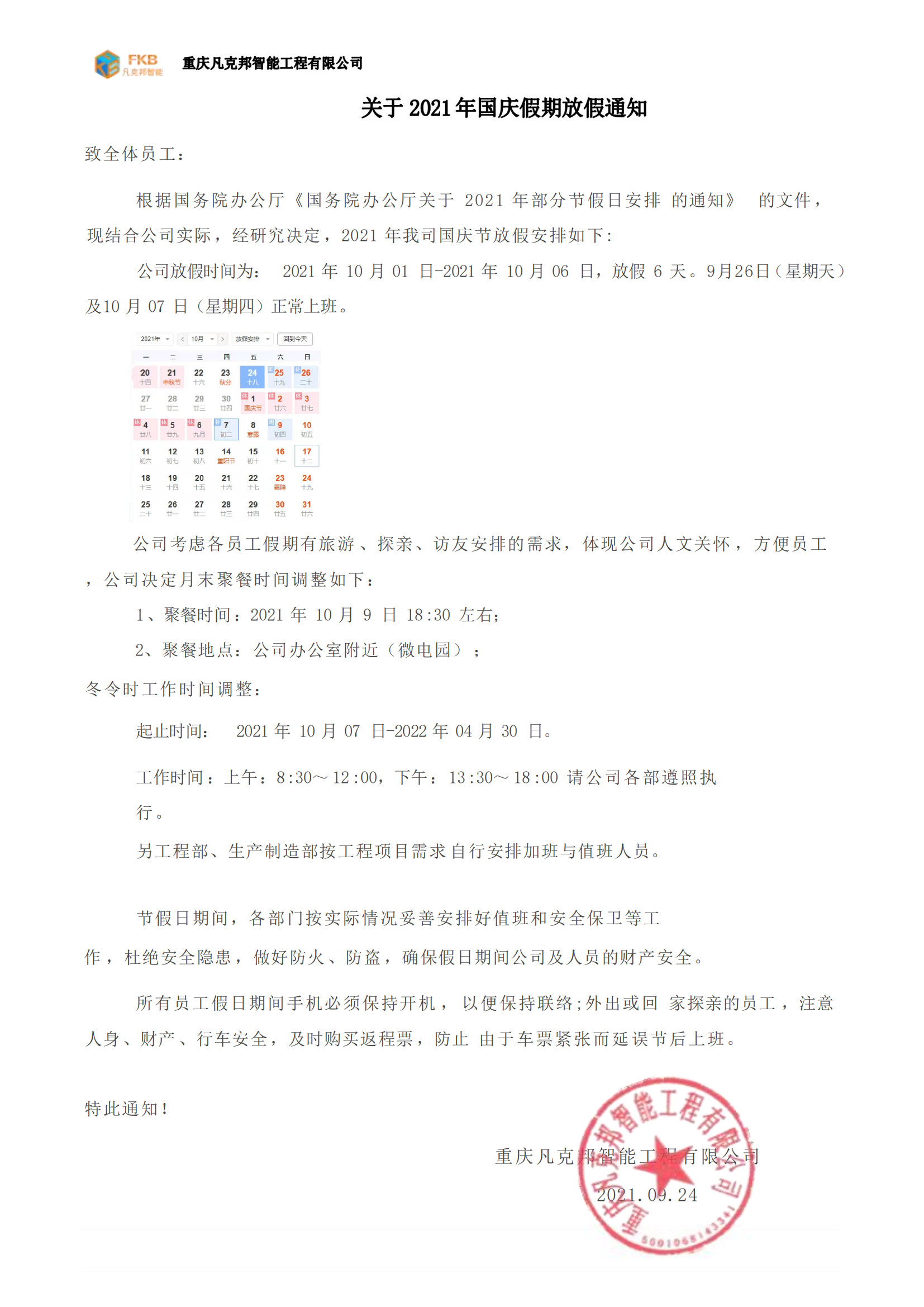 2021年國慶節(jié)放假通知:2021年10月1日-10月6日,放假6天。9月26日(星期天)及10月7日(星期四)正常上班。冬令時工作時間調(diào)整:起止時間:2021年10月7日-2022年4月30日。工作時間:上午8:30-12:00,下午13:30-18:00。